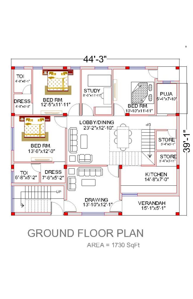 This 30*50 floor plan is perfect for families who want to create their dream home in a beautiful and spacious layout. This design allows homeowners to make the most of natural light and optimize built-in storage spaces throughout the house. It is a 2500 sqft with pooja room, kitchen, bedrooms, bathrooms, drawing room, living room, parking, open garden etc and built-up area for ground floor is 1500 sqft and for first floor built up area is 1500 sqft. Enhance your lifestyle by maximizing modern convenience in this impressive 1500 sqft plot size. architect9